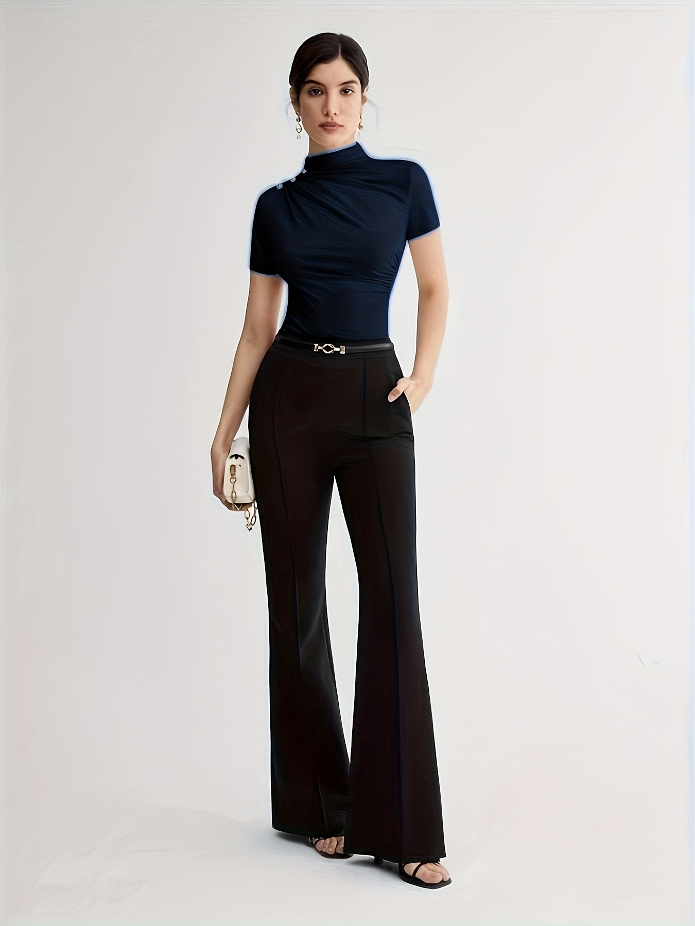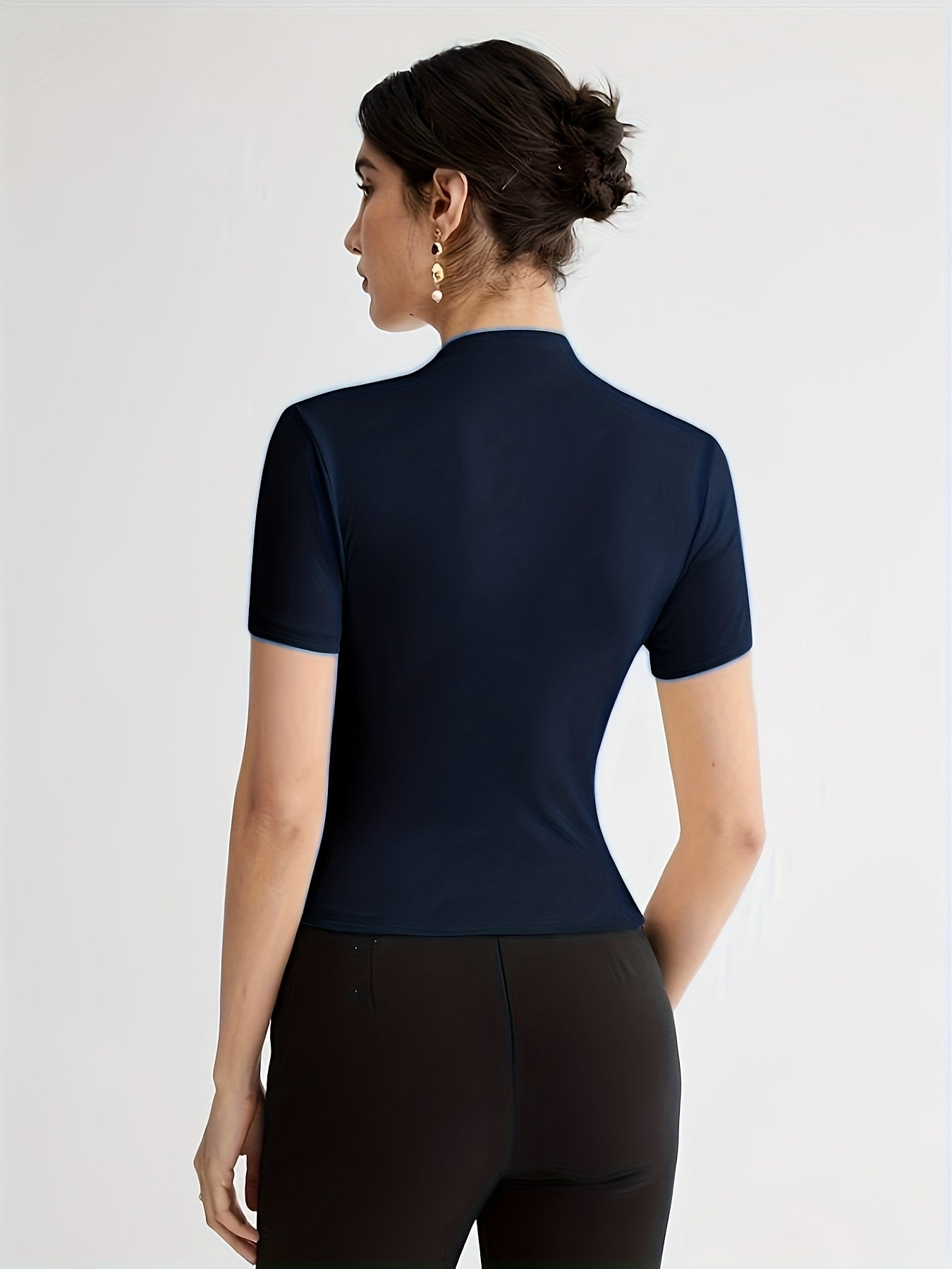Էլեգանտ սպիտակ կարճ թևքով, բարձր օձիքով վերնաշապիկ՝ կոճակներով դետալով - Կանացի բազմակողմանի ամառային բլուզ, առօրյա հագուստ | Մինիմալիստական ոճ | Նրբագեղ չափս