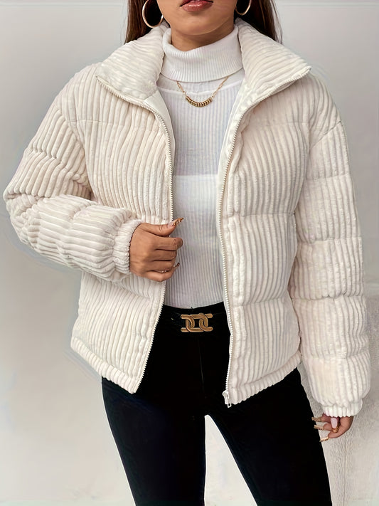 Women's White Puffer Jacket with Full-Zip Closure & Corduroy-Like Outer - Beige Winter Coat, Machine Washable Cold Weather Outerwear, Elegant Short-Cut Length (No Belt) for Casual or Formal Use, Jackets For Women, Winter Clot