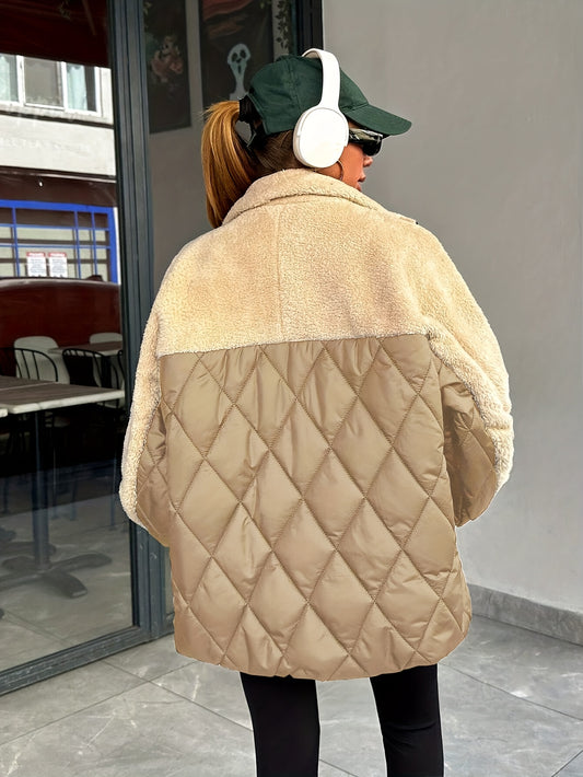 Men'S Winter Faux Fur Coat - Warm Color-Block Lapel Collar Jacket with Zipper Closure, Black & Beige Contrast Design, Regular Fit for Casual & Formal Wear, Polyester Lining, Stylish Streetwear, Faux Fur Coat