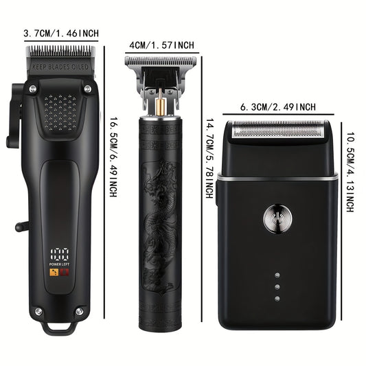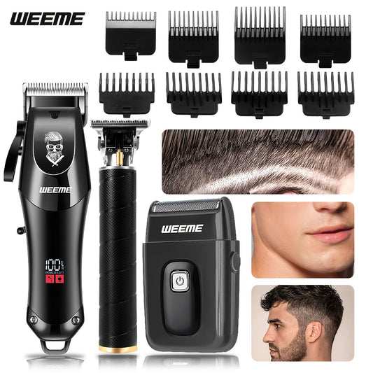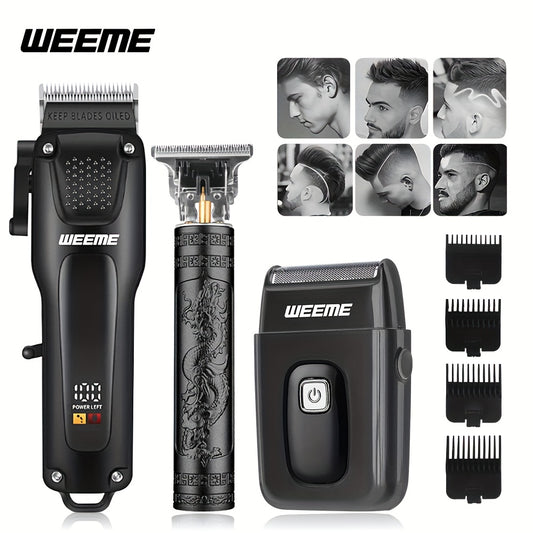 WEEME 3pcs Men's Grooming Kit: Black USB Rechargeable Electric Clipper + T-Blade Trimmer + Shaver Combo, featuring an LCD display and anti-slip textured design for precise haircuts, beard trimming, and sideburns styling—per