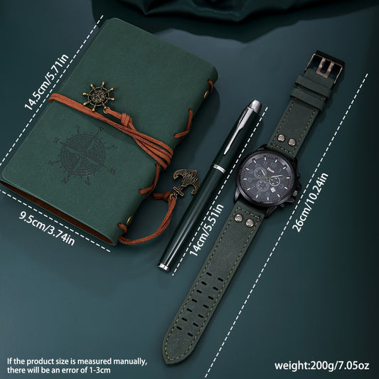 3pcs Vintage-Style Notebook Set + Versatile Business Watch And Pen, a Perfect Gift for Him for Birthdays And Anniversaries.