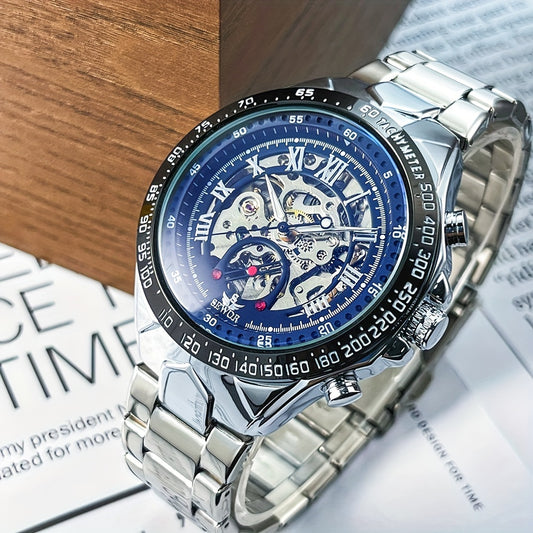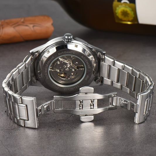Men's Business Leisure Automatic Mechanical Watch, Stainless Steel with Blue Accents, Transparent Back, Date Display, Water-Resistant up to 10m, Ideal Gift, Business Watch | Mechanical Aesthetic | Stainless Steel Band