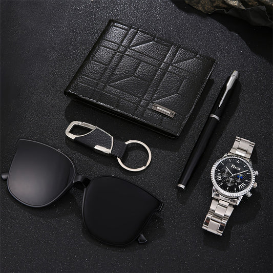 5pcs Men's New Fashionable Multifunctional Elegant Watch Gift Set with Business Steel Strap, Multi-Function Wallet, Glasses, Keychain, Hair Clipper, Suitable as His Holiday Present, Perfect for Thanksgiving