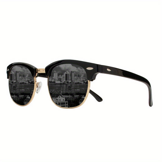 2pcs ZXRCYYL Designer Semi-Frame Fashion Glasses for Women & Men - Vintage Black & Golden Metal Frame with Green Tinted Decorative Lenses, Lightweight Retro Urban Cityscape Print, Half-Rim Fashion Accessories, Stylish Glasses