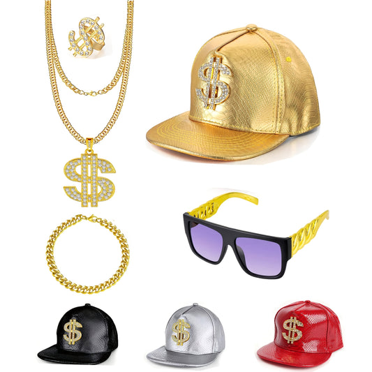 5pcs Hip Hop Costume Kit 80s 90s Rapper Accessories Set Golden Rapper Hat Baseball Cap Punk Fashion Glasses Golden Dollar Sign Pendant Necklace Ring Bracelet for Men Women Carnivals, throwback party Outfit Halloween Jewelry f