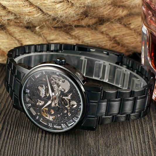 1pc T-WINNER Men'S Luxury Skeleton Automatic Mechanical Watch with Luminous Hands, Black Stainless Steel Strap & Roman Numerals - 3ATM High Quality, Business Casual Style, Includes Gift Box, Business Casual Watch | Skeleton W