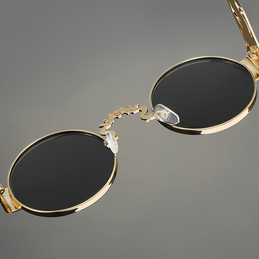 A Pair Of Men's Stainless Steel Retro Round Frame Glasses, Chinese Dragon And Phoenix Carving Hollow Arms, Casual Hip-hop Punk Street Party Fashion Trend Decorative Glasses, With PC Lenses