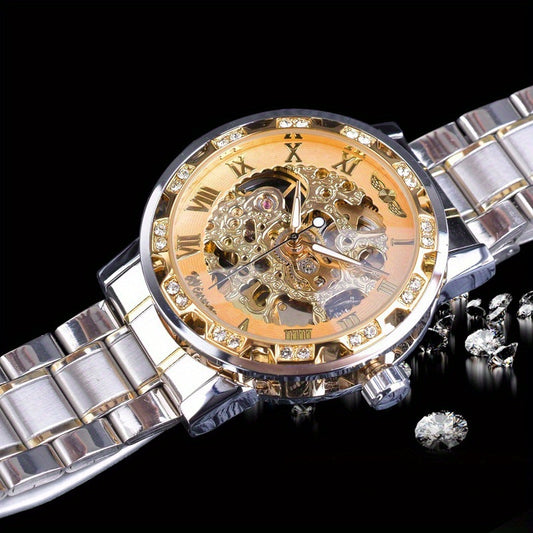 Fashion Classic Roma Watch Men Luxury Golden Skeleton Mechanical Hand Watches Casual Business Wristwatches Men Blue & Golden Accents, Casual Yet Versatile, Best Seller, Ideal Gift, Mechanical Movement, Watch Accessories, With