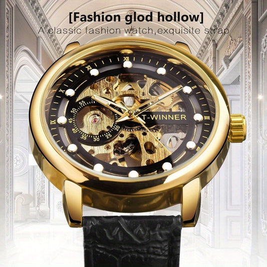 Men'S Luxury Mechanical Skeleton Watch with Golden-Tone Alloy Case & Faux Leather Strap - Mechanical Hand-Wind, World Time, Date Display, Elegant Fashion Accessory for Casual Attire, Mechanical Watch, Sophisticated Design, In