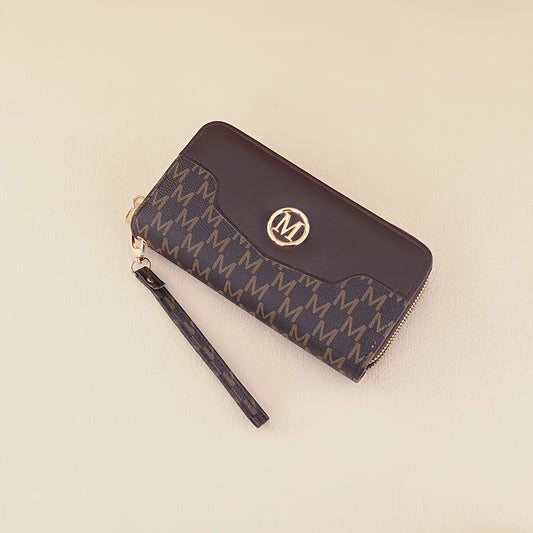 Women'S Elegant Patchwork Wallet & Wristlet Clutch - Large Capacity Double-Zip Coin Purse with Golden-Tone M-Logo, Golden-Tone Hardware & Wrist Strap