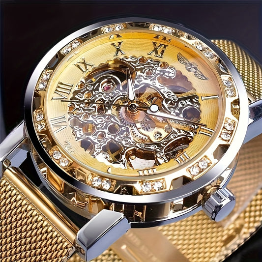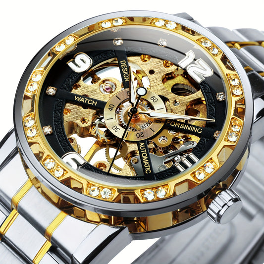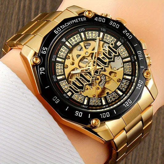 1pc Fashion Luxury Golden Skeleton Automatic Mechanical Watch for Men Luminous Hands Top Brand Stainless Steel Strap Business Casual Mens Watches Festival Birthday Gifts, TWINNER