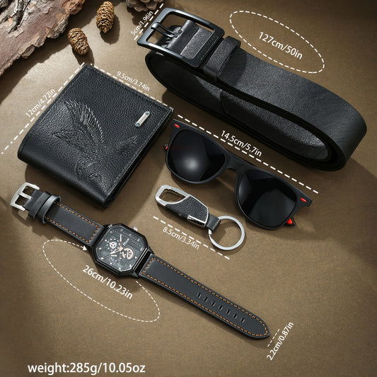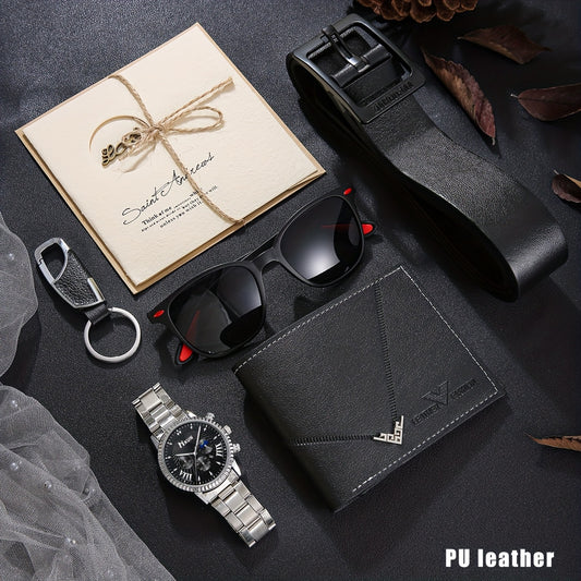5pcs Men'S Luxury Casual Business Style Gift Set - Black Faux Leather Watch, Fashion Wallet, Everyday Belt, Glasses, Keychain - Ideal for Valentine's, Thanksgiving, Christmas