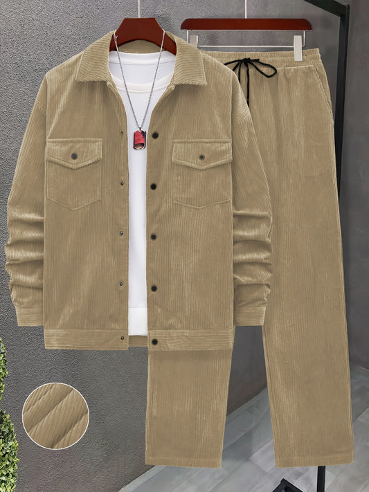 Men'S 2pcs Set of Woven Textured Fabric Work Bag Long Sleeve Jacket And Drawstring Casual Loose Pants Suit