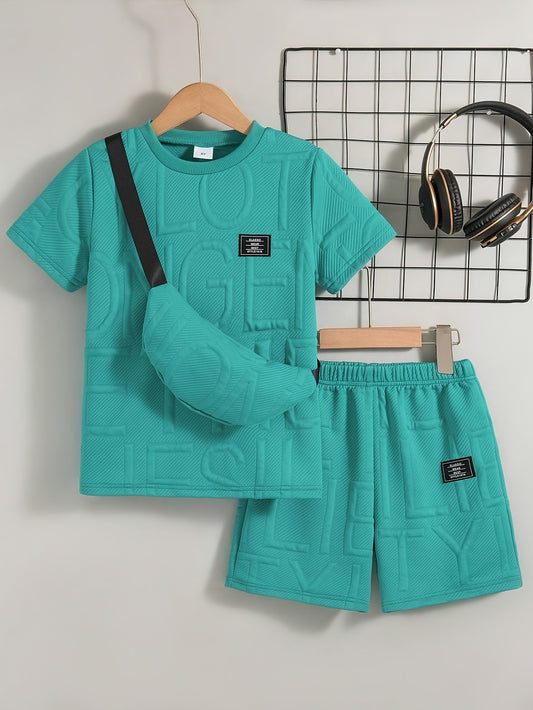 Boys' 3pcs Set White Crew Neck T-Shirt with EASY Lettering & Green Elastic Waist Shorts & Green Crossbody Bag Casual Comfortable Outdoor Outfit, Gift Idea, Perfect for Outdoor