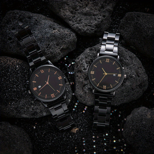 8pcs/set Men'S Black Minimalist Quartz Watch Set with Bracelet, Necklace, And Ring – Elegant Timepiece Gift Box for Casual And Formal Use, Box not included
