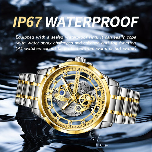 BINBOND Men's Sleek Golden-Tone Quartz Watch - Transparent Dual-Sided Hollow Design, Waterproof with Luminous Hands, Stainless Steel Band, Ideal Gift