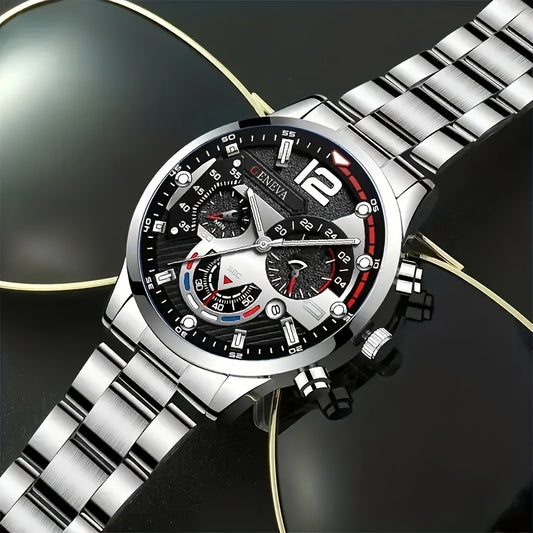 Luxury 8pcs Men'S Gift Set: Stainless Steel Quartz Watch with Calendar, Golden Arrow Necklace, Bracelet & Ring - Elegant Business Casual Accessories for Valentine's, New Year, Easter, Ramadan, Birthdays, Christmas, Halloween