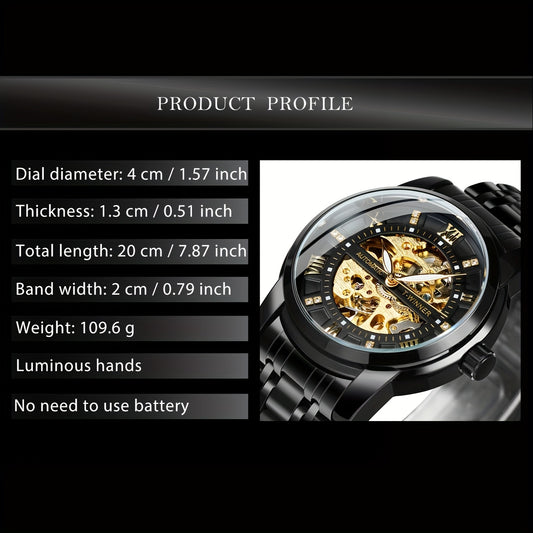 1pc Vintage Iced Out Skeleton Mechanical Watch for Men - Luminous Hands, Stainless Steel Strap, Fashion Business Watch, Top Brand Luxury Wristwatch with Box, Waterproof 30m, Casual Style, Mechanical (not Self-winding), No Bat