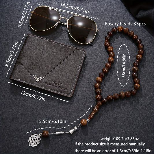 3pcs Men's Business Premium Gift Set: A professional wallet exudes sophistication, agarwood beads enhance workplace wisdom, and high-definition glasses ensure clear vision. The complete set showcases elegance for business gif