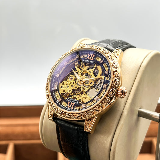 Vintage Hollow Carved Automatic Mechanical Men'S Watch, Fashionable Luxury Men'S Watch, High-end Thickened Mechanical Style Hip-Hop Party Wristwatch, Without Battery