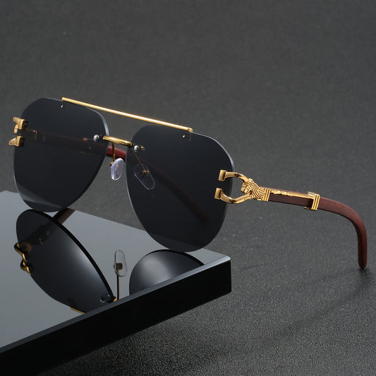 A Pair of Men'S Golden Double-Bridge Frameless Oval Glasses with Leopard Decoration And Faux Wood Grain, Stylish Unisex Eyewear.