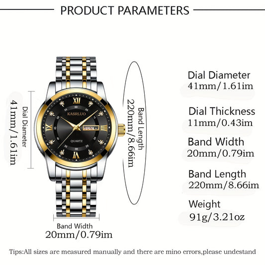 1pc KASRLUO Men'S Business Sports Watch - Stainless Steel Band, Double Date Display, Quartz Movement, Round Alloy Case, Electronic Drive, Calendar Feature, Ideal Gift for Men, KASRLUO
