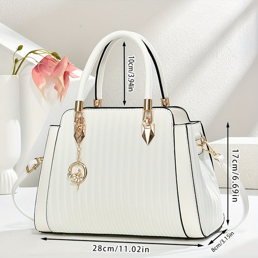 Elegant Wo 's Handbag with Detachable Shoulder Strap, Golden-Tone Hardware & Chic Leaf Charm - Stylish White Satchel for Everyday Use, Casual Chic Bag | Stylish Charm Handbag | Bag