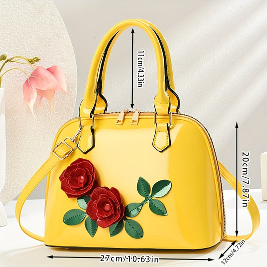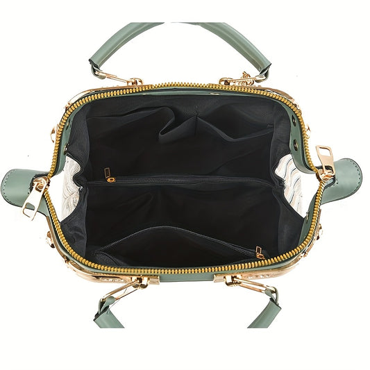 Chic Floral Print Handbag for Wo - Spacious 3-Layer Design with Pockets, Zip Closure, Durable PU Material - Available in Khaki, Cream, Green, Blue, Black