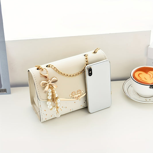 Women's White Crossbody Bag with Golden-Tone Chain Strap, & Bow Charm Accents - Lightweight Clutch Purse for Work, Travel, Beach - Perfect Gift for Christmas, Birthdays, Mother’s Day, Crossbody Purse, Beach Accessory, Decor