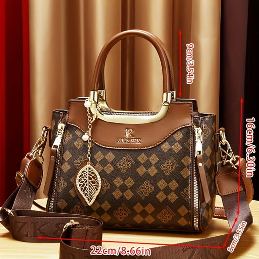 Vintage Style Top-Handle Satchel Bag with Adjustable Strap, Solid Coffee-Colored PU Material with Plaid Pattern, Zipper Closure, Polyester Lined, Fashionable Accessory for Business And Casual Outings