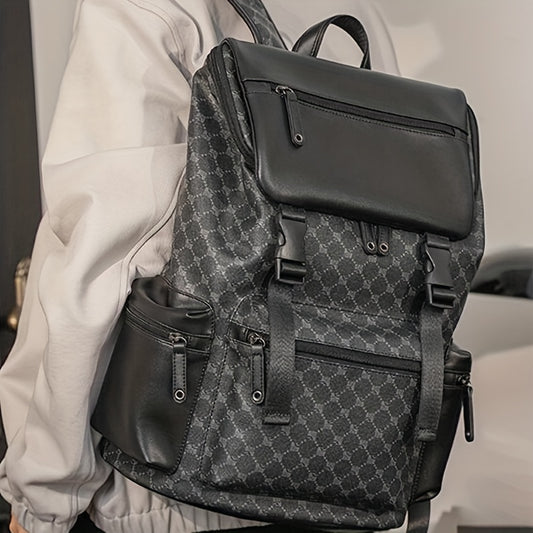 Men'S Stylish Black Brown Gingham Print Backpack - Versatile Commuter Bag with Multiple Pockets, Adjustable Straps, and Golden-Tone Hardware for Work, Travel, and Study, Travel Backpack Gingham Pattern Synthetic Backpac