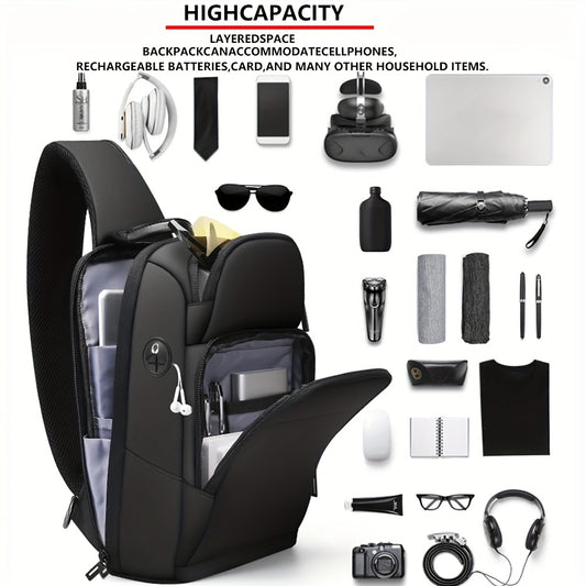 HUABUPS Men'S Crossbody Backpack - Black PVC Business Commuter Bag with USB Charging, Adjustable Strap, Multiple Compartments Durable Design for Travel, Hiking, Daily Use - Ideal Gift for Men, Hiking Gear, Stylish Accessory