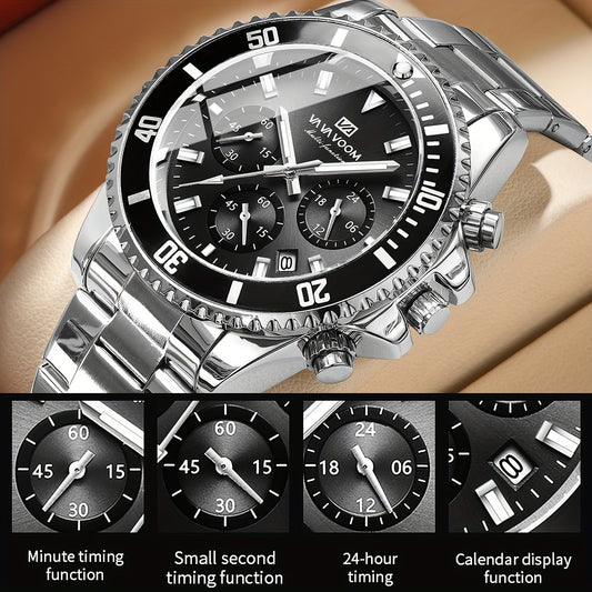 VA VA VOOM Men's Sport Watch with 3D Large Dial, Stainless Steel Band, 24Hr Chronograph, Dual Time, Calendar, Stopwatch & High Quality - Quartz Movement for Gym, Outdoor, Business Casual - Ideal Gift, Outdoor Timing Tool, Sle
