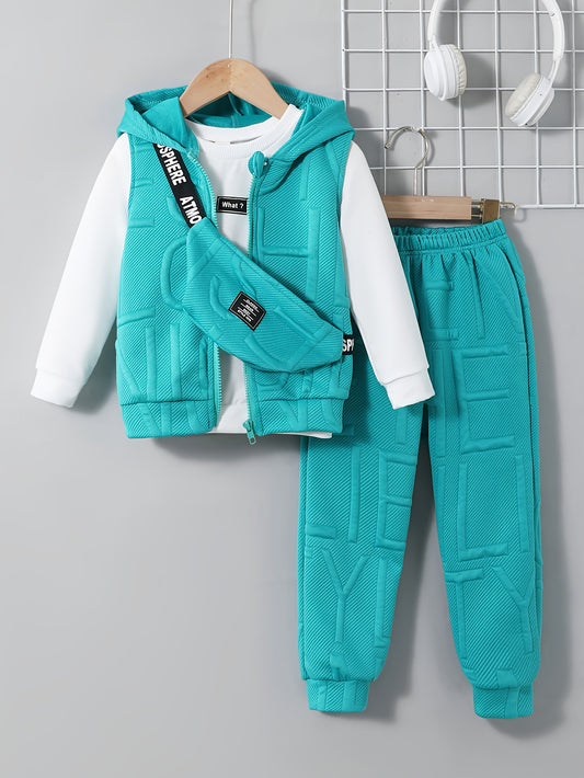 4pcs Boys' Casual Set: Letter Vest + Solid Color Long Sleeve Top + Elastic Waist Joggers with Crossbody Bag - Comfortable Lightweight Trendy Sportswear for Autumn/Winter Outdoor Activities, Perfect for Outdoor