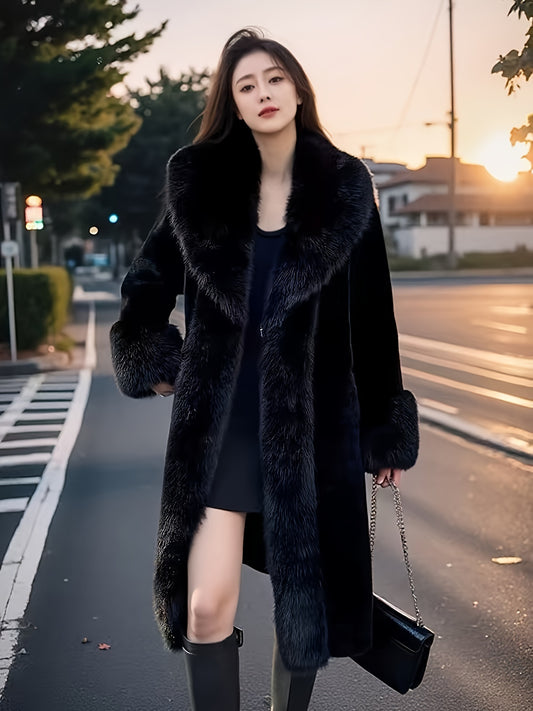 Elegant Women's Winter Coat with Luxurious Faux Fur Lining - Plus Size Longline H-Silhouette Coat, Large Lapel Collar & Solid Color Design, 100% Polyester for Casual & Formal Outfits