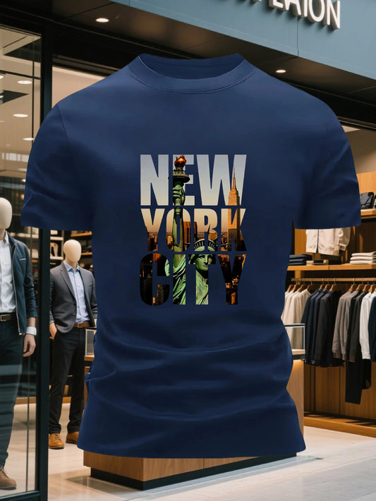 Men's 100% Cotton Crew Neck Short Sleeve T-Shirt with New York City Graphic Print - Navy Blue Casual Comfort Fit Tee, Machine Washable Everyday Essential, Allseason Apparel, Comfortable Outfit, Urban Style, Breathable Materia
