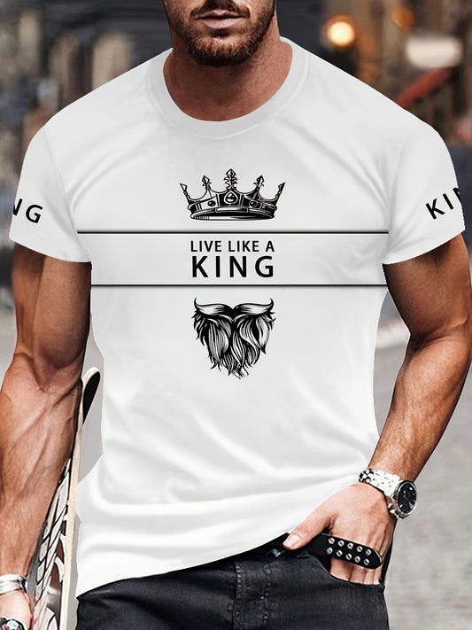 Men's 3D Digital Print T-Shirt with Crown "LIVE LIKE A KING" Slogan - Casual Round Neck Regular Fit Machine Washable Graphic Tee for Casual Attire, Streetwear Fashion, Bold Statement Shirt, Durable Fabric Shirt