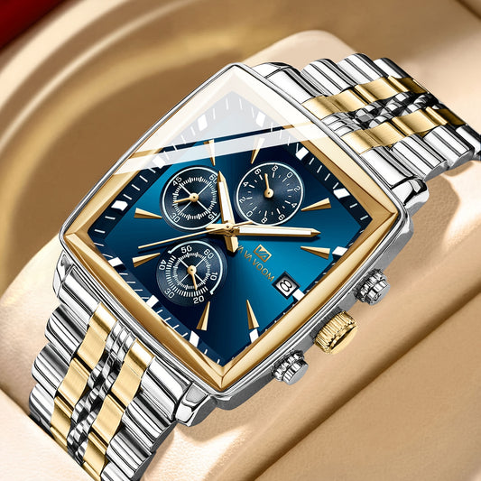 VA VA VOOM Brand New Arrival 1pc Fashionable Golden & Blue & Silveryy & Black Stainless Steel Strap, Oversized Square Dial, Multifunctional Six Needle Three Eyes, with Calendar Window, Luminous Function, High-Quality Fashiona