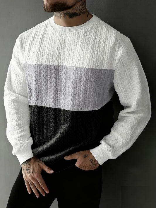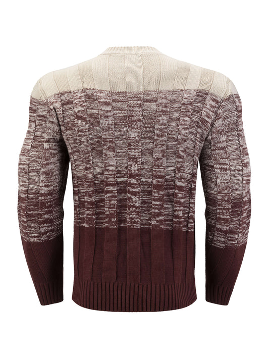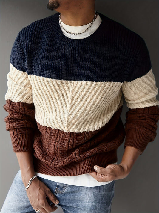 Men's Autumn and Winter Trendy Outfit, Fashion Casual Color Block Knit Pullover Sweater with Multi-Texture Round Neck Long-Sleeve Design