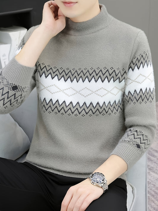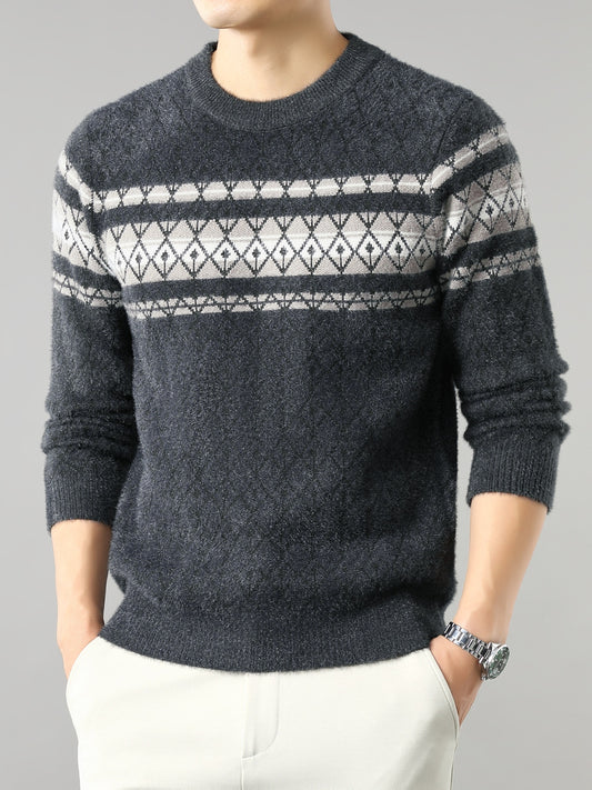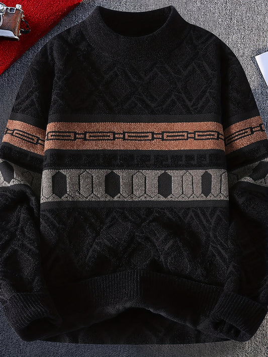 Men'S Sweater with a Round Neck, Featuring a Thickened Design for Autumn And Winter, Complex Patterns, Contrasting Stripes, And a Casual Retro Style in a Regular Fit, Knit