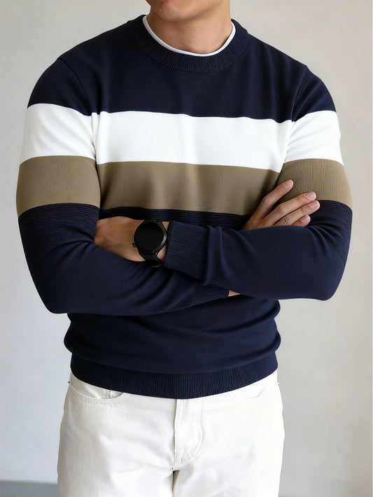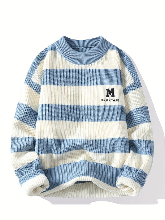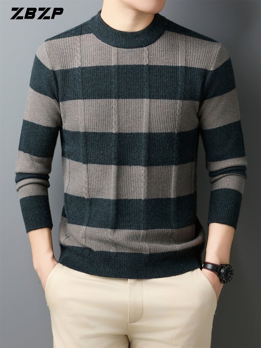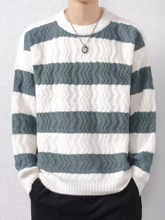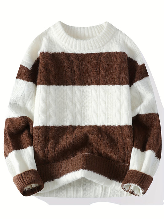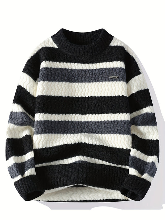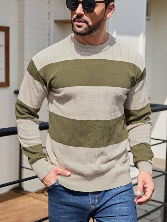 Men's Winter Warm Sweater - Striped Round Neck Pullover with Color-Blocking Suitable for Layering, Hand Washable Casual Sweaters for & (Autumn/Winter)