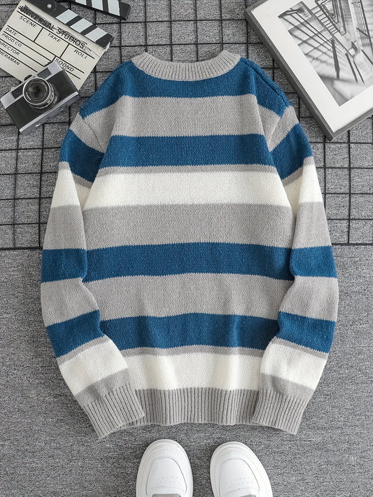Men's 2025 Autumn/Winter Striped Sweater for Youth with Color Block Round Neck Casual Warm Knitwear