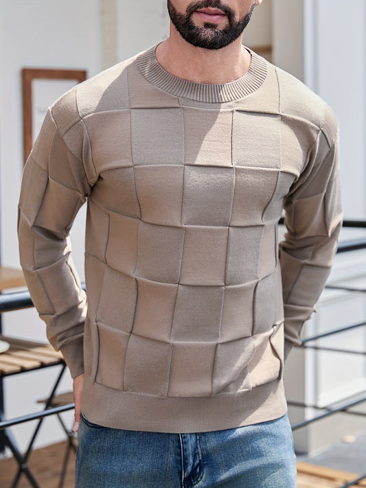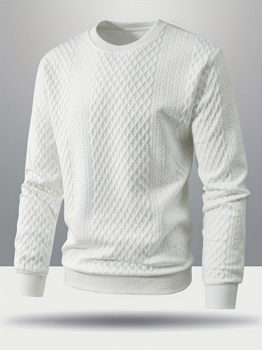 Men'S Round Neck Casual Solid Color Sweater with Textured Geometric Patterns, New Trendy Long-Sleeve Pullover for Autumn And Winter