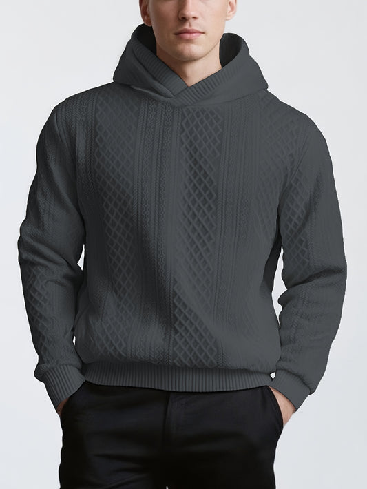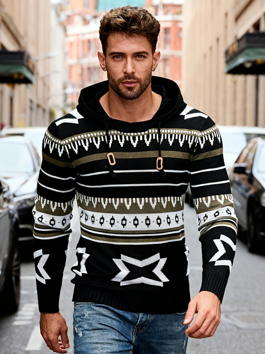 Men'S Hooded Pullover for Autumn And Winter, Featuring a Geometric Knit Pattern, Street Style, And a Cozy Knitted Sweater