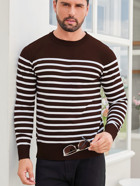 Men'S Stylish Striped Knit Pullover Sweater - Casual Round Neck, Suitable for Wearing in Spring, Autumn, And Winter