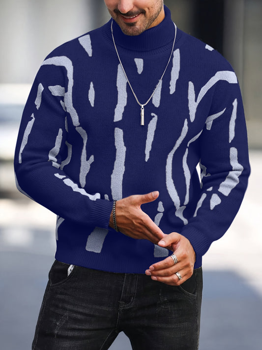 Men's Zebra Print High Neck Novelty Sweater Autumn Winter Casual Knit Pullover