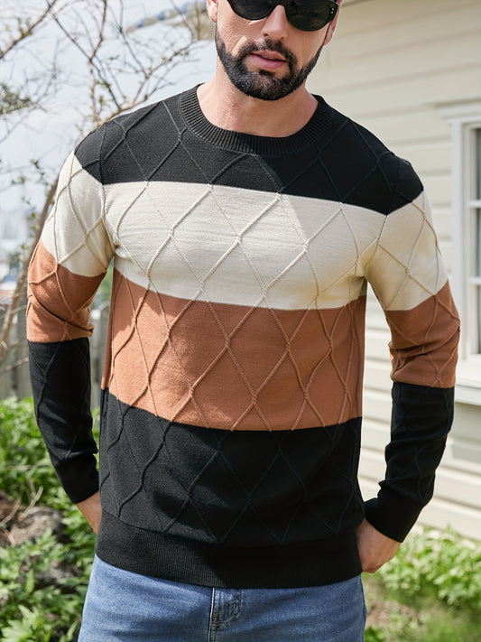 Men's Sweater with Color Block Design, Slim Fit, Crew Neck Pullover, Autumn/Winter Style