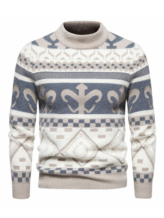 Men'S Round Neck Sweater for Autumn And Winter, Featuring a Casual Long Sleeve Design with a Three-Color Geometric Pattern And Jacquard Knit
