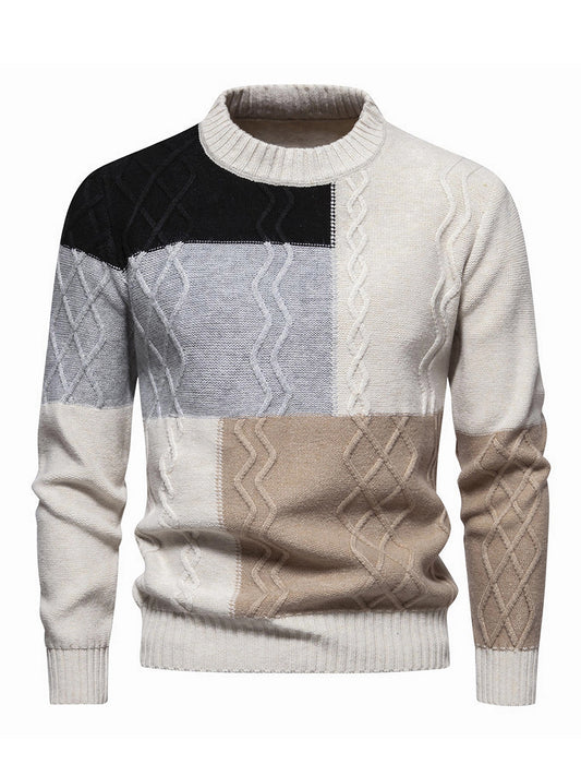 Men's Autumn and Winter Color Block Knit Sweater, Crew Neck Pullover