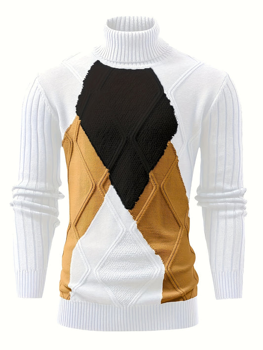Men's Geometric Color Block Knit Sweater - Relaxed Fit Drop Shoulder Long Sleeve Pullover with Ribbed Detailing, Warm Winter Casual Top for Fall & Winter, Knitted Sweater, Autumn Wardrobe, Comfortable Clothing